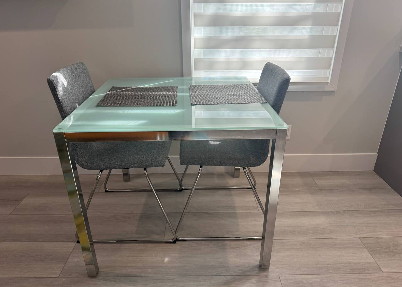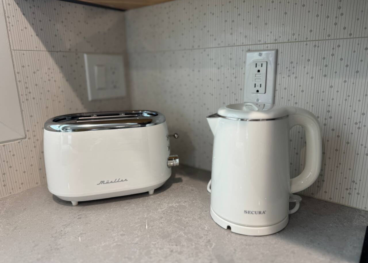 The bedroom has a full-size bed and a twin size futon in the living room that converts into a mattress. There's a dining table for two, a desk, fully stocked kitchen with electric stove, microwave, coffee machine, toaster and dishwasher.